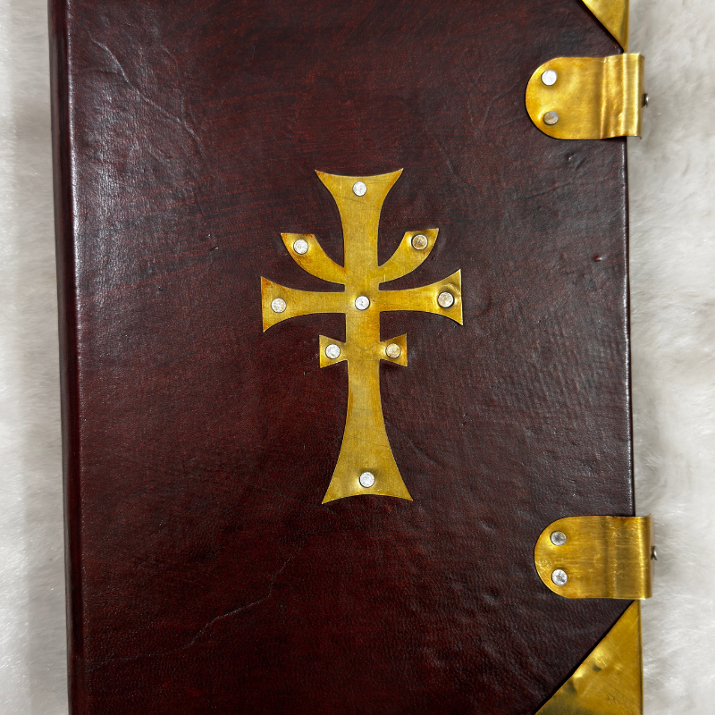 Artisan-crafted illuminated manuscript featuring hand-painted medieval-style artwork and subtle gold leaf detailing. Designed for premium display.